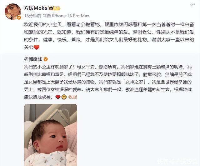 10�日下午,香港养和医院门口,       郭富城亲自驾车载着岳父岳母来接三胎宝宝出院       。头戴鸭舌帽和口罩的他,全程紧张地盯着护士将婴儿篮小心翼翼放入车内,生怕有一丝闪失。       尽管已是第三度当爸爸,59岁的郭富城神情却如同新手爸爸一般谨慎小心。一个多小时后,他在微博上官宣了这一喜讯:“我们的小公主终于到家了!母女平安,感恩所有。”       郭富城不仅宣布了三胎女儿出生的好消息,       还首次晒出了宝贝女儿的正面照       ,这一举动让粉丝们惊喜不已。此前两个女儿出生时,他都小心翼翼地保护着孩子的隐私,未曾公开过真容。       从照片上看,三宝完美继承了父母的高颜值基因,       玲珑大眼睛、翘鼻子和小嘴巴十分可爱       ,五官复刻了妈妈方媛的精致,将来必定是个美人胚子。       郭富城难掩内心喜悦,发文称:“我们家现在拥有三颗璀璨的明珠,我感到无比幸福和富足。”他还透露,两个姐姐已经迫不及待要照顾妹妹了,家庭画面温馨有爱。       此前,网络上曾有传言称方媛第三胎生了男孩,甚至连孩子的体重细节都被曝出。然而这是一个彻头彻尾的假消息。       郭富城在官宣中特别强调“无论是儿子或是女儿都是上天赐予我最珍贵的礼物”       ,有力地回应了长久以来关于他“重男轻女”的传言。       事实上,早�񀙕日的成都演唱会上,郭富城就曾提前打过预防针。面对粉丝和媒体的猜测,他公开表示:“我从来没有刻意追求生儿子,都是我的孩子,我都是那么地爱。再生一个三宝是女儿,我也很开心啊!”       在郭富城官宣后不久,方媛也在社交平台上发文表达了自己的幸福感受:“欢迎我们的小宝贝,看着老公抱着她,眼里依然闪烁着和第一次当爸爸时一样兴奋和宠溺的光芒,就知道,我们拥有的是最纯粹的爱。”       她特别强调:“       性别从不是我们爱的条件       ,健康、快乐、善良,才是我们给女儿们最好的礼物。”这番话语不仅是对三胎女儿的祝福,也被视为是对外界猜测的间接回应。       方媛还表达了对丈夫的感谢:“感谢老公,谢谢大家一直以来的关心。”尽管刚刚生产完身体尚且虚弱,但她仍然第一时间与粉丝分享了自己的喜悦心情。       郭富城与方媛相�岁的婚姻,最初并不被外界看好       。两�年公开恋情,2017年正式步入婚姻殿堂,如今已携手走过八年时光。       在这八年中,方媛以低调、贤惠的个性赢得了大家的认可。与一些名人妻子或女友的高调作风不同,她默默经营着家庭和生活,最终       将外界的质疑变成了祝福       。       10�日,郭富城还曾带着孕晚期的方媛一起参加香港赛马活动,当时爱驹胜出的郭富城兴奋地与妻子相拥庆祝,还开心地轻抚方媛的孕肚,与宝宝互动,画面温馨有爱。       如今,       郭富城将停工一个月,全心陪伴妻子和孩子       。       四天后就是郭富城�岁生日,三胎女儿的降临无疑是他最好的生日礼物。他曾说自己是“全世界最幸运的男士,被四位女神深深爱着”。
